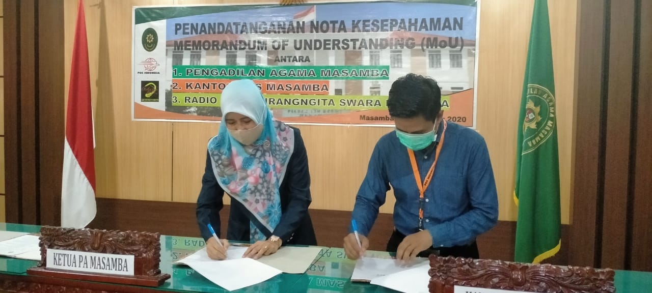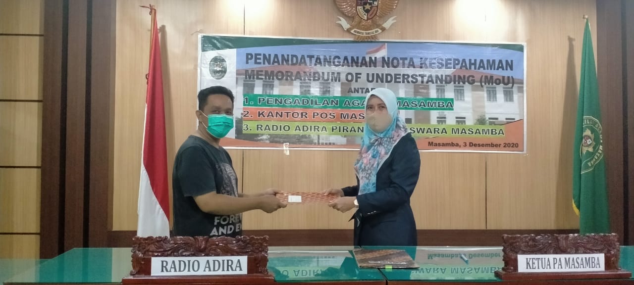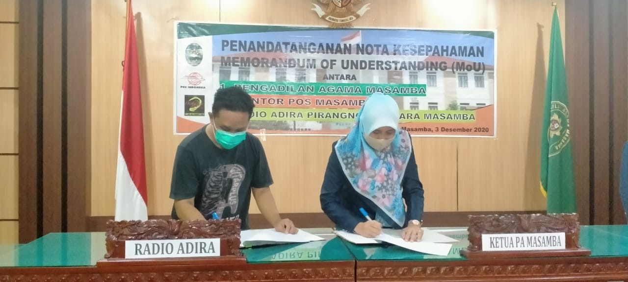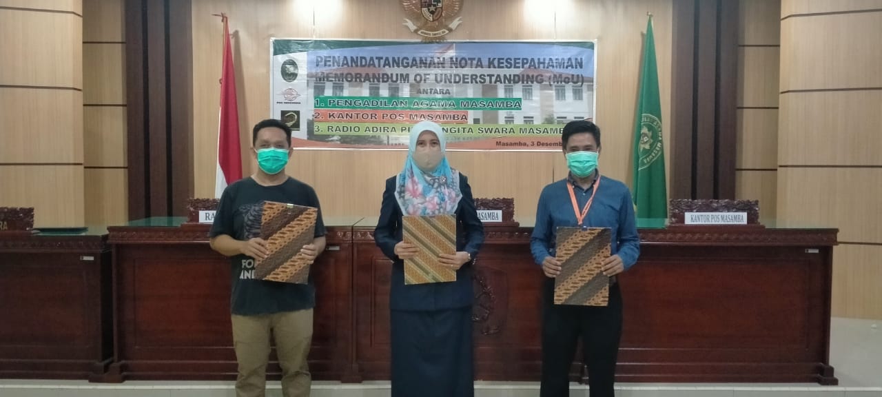Masamba, 3 Desember 2020. Bertempat di Ruang Sidang Pengadilan Agama Masamba dilaksanakan Penandatanganan Nota Kesepahaman (Memorandum of Understanding) antara Pengadilan Agama Masamba dengan Kantor Pos Masamba dan Radio Adira Piranggita Swara. Nota Kesepahaman ini ditandatangani oleh Ketua Pengadilan Agama Masamba Laila Syahidan, S.Ag., M.H. dan Kepala Kantor Pos Masamba, Aras serta Pimpinan Radio Adira Piranggita Swara, Achmad Muchtar.