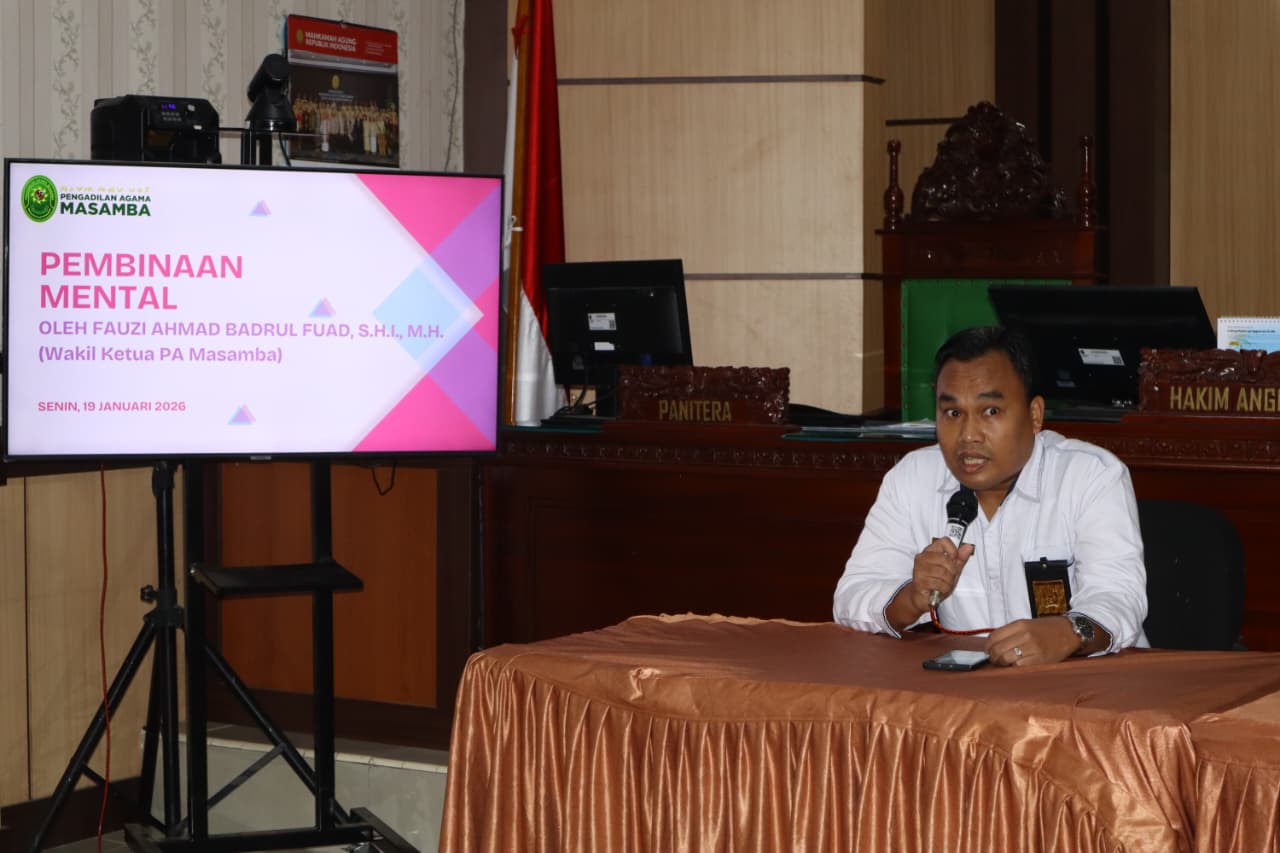 Wakil Ketua Pengadilan Agama Masamba Fauzi Ahmad Badrul Fuad, S.H.I., M.H. memberikan pembinaan mental kepada seluruh aparatur PA Masamba. Fauzi membacakan dua ayat pada surat Al-Araf ayat 9-10. "Dan barang siapa yang ringan timbangan (kebaikan)-nya, maka itulah orang-orang yang merugikan dirinya sendiri, disebabkan mereka selalu mengingkari ayat-ayat Kami." Q.S. Al Araf 9. Ayat ini berkaitan erat dengan Hakim dan aparatur Pengadilan Agama Masamba untuk mengawasi diri sendiri dan senantiasa merasa diawasi oleh Allah Subhanahu wa'taala dalam melaksanakan tugas.