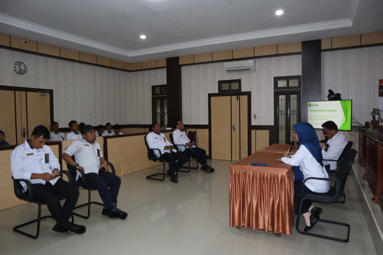 Ketua Pengadilan Agama Masamba Nirwana, S.H.I., M.H. memberikan pembinaan umum kepada hakim dan pegawai selepas apel pagi.