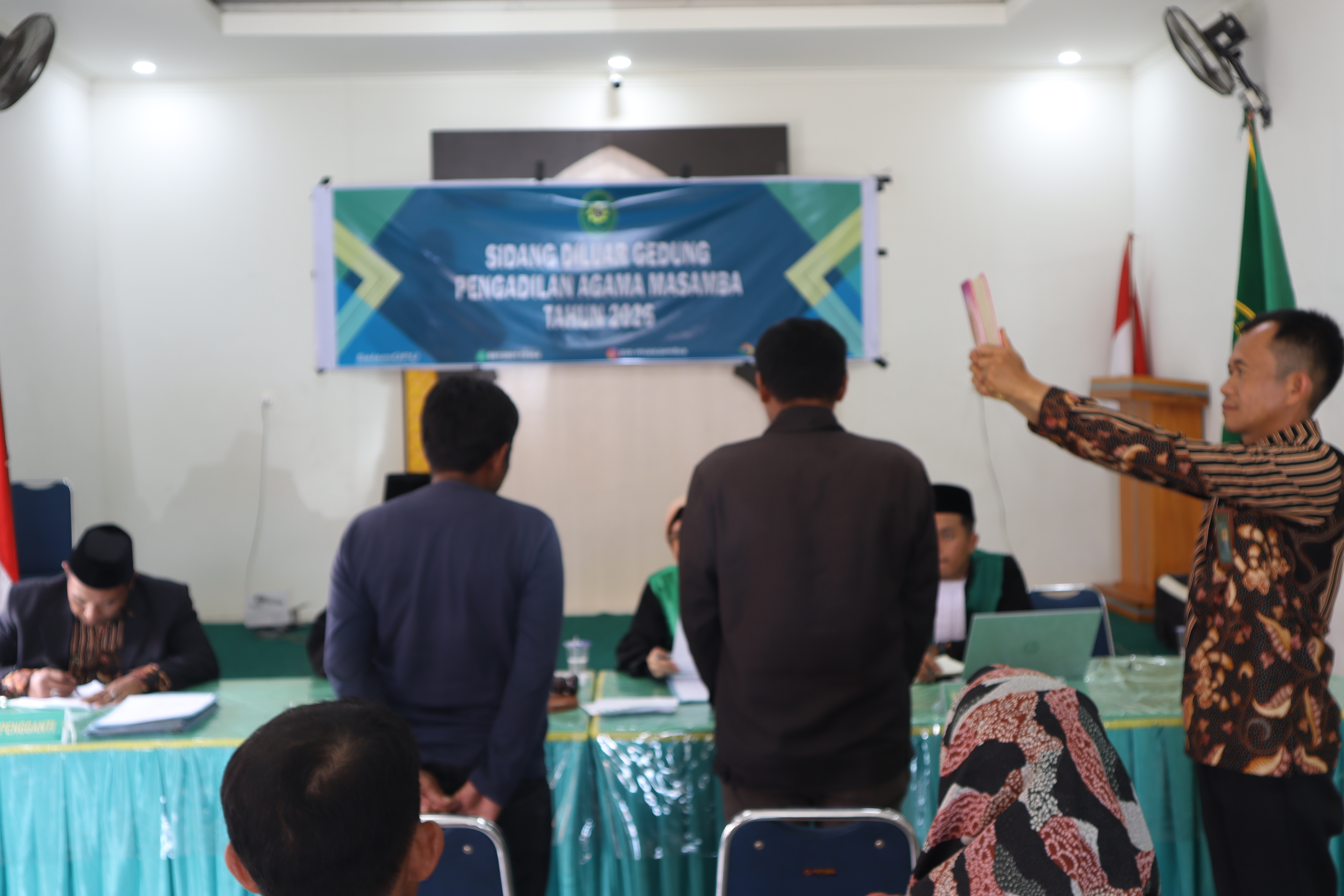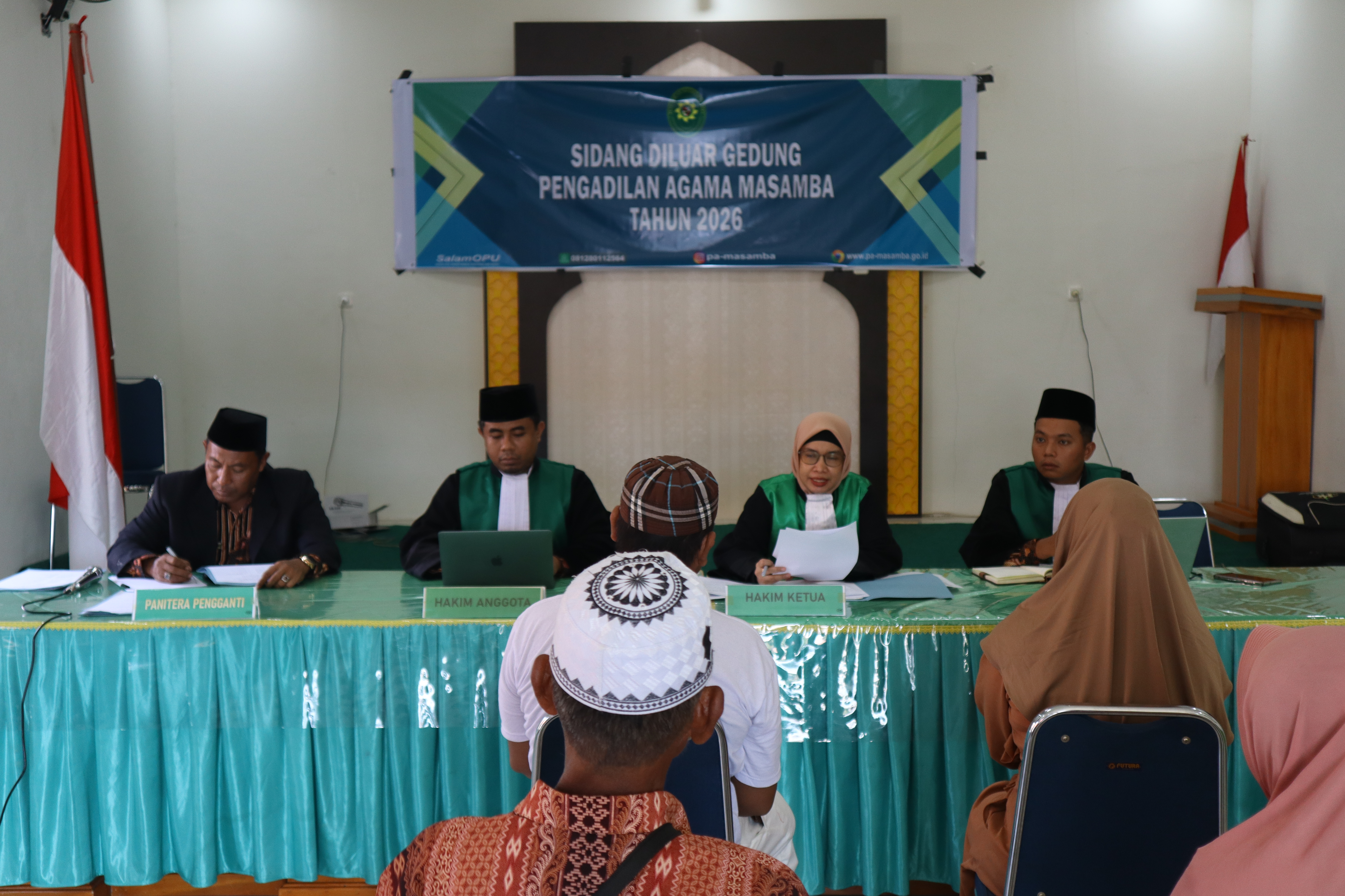 Pengadilan Agama Masamba kembali menggelar Sidang di Luar Gedung untuk pertama kalinya tahun 2026 di Kantor Urusan Agama Kecamatan Baebunta. Ketua Pengadilan Agama Masamba Nirwana, S.H.I., M.H. memimpin tim sidang di luar gedung (20/01/2026). Nirwana didampingi 2 orang hakim anggota yaitu Muh. Aunnur Rafiq Mukhlis, S.H. dan Fahmi Mujtaba serta Panitera Sidang Wahyudi Kurniawan, S.H.. Tim Sidang di Luar Gedung bertolak dari kantor Pengadilan Agama Masamba menuju Kantor Urusan Agama (KUA) Kecamatan Baebunta pukul 08.30 WITA. Tiba di lokasi Sidang di Luar Gedung, tim langsung bersiap melaksanakan persidangan. Sekurangnya sepuluh perkara permohonan disidangkan oleh Majelis A yang dipimpin oleh Ketua Majelis Nirwana, S.H.I., M.H. Dengan adanya pelaksanaan Sidang di Luar Gedung di berbagai lokasi di wilayah yurisdiksi Pengadilan Agama Masamba dapat memberikan kemudahan akses keadilan kepada masyarakat di Kabupaten Luwu Utara.