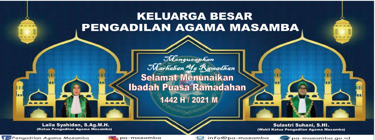 Dalam menyambut awal mula Bulan Ramadhan 1442 H Pengadilan Agama Masamba mengucapkan Selamat Menunaikan Ibadah Puasa Ramadhan 1442 H. Semoga ibadah puasa kita lancar dan selalu diberikan berkah dalam menjalankan kewajiban sebagai umat muslim hingga 30 hari kedepan.