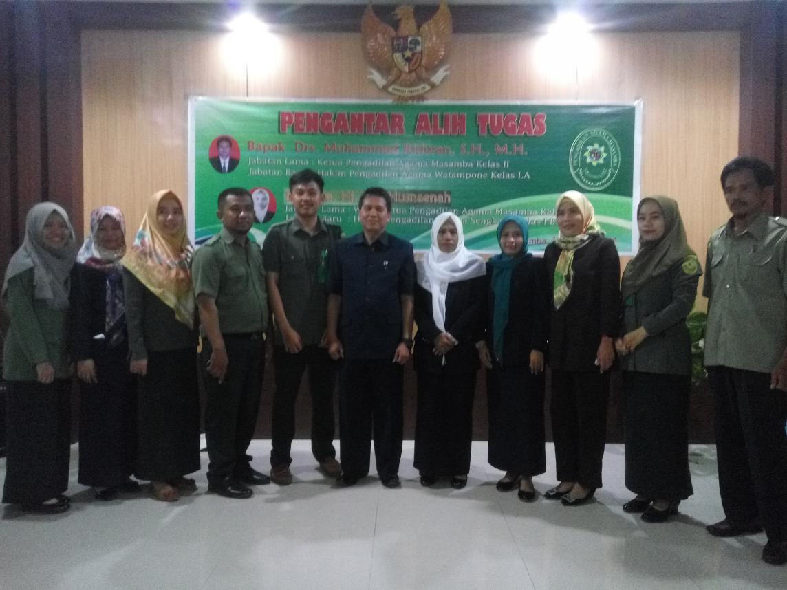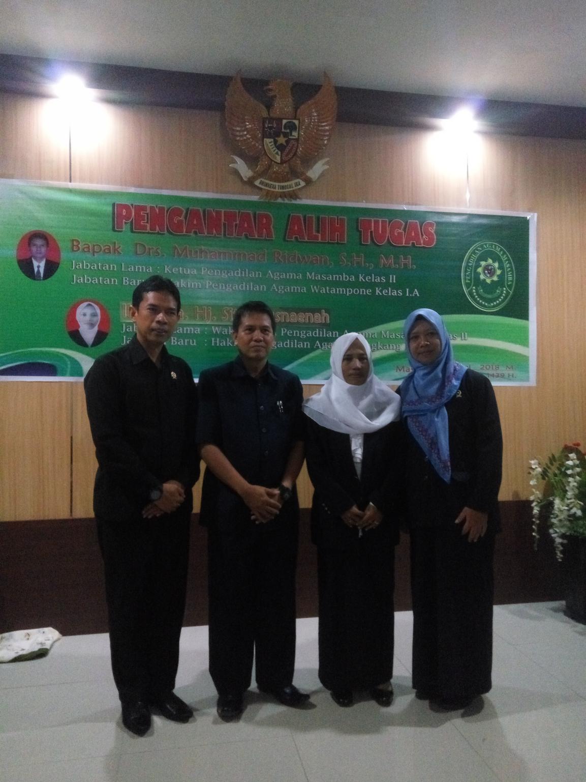 Pada hari Kamis, tanggal 3 Mei 2018 bertempat di ruang sidang utama Pengadilan Agama Masamba diadakan acara pengantar alih tugas Bapak Drs. Muh. Ridwan, S.H., M.H yang semula menjabat sebagai Ketua Pengadilan Agama Masamba kelas II, beralih tugas menjadi hakim Pengadilan Agama Watampone kelas IA. Sementara Ibu Dra. Hj Sitti Husaenah yang semula menjabat sebagai Wakil Ketua Pengadilan Agama Masamba kelas II menjadi Hakim Pengadilan Agama Sengkang kelas I.B.