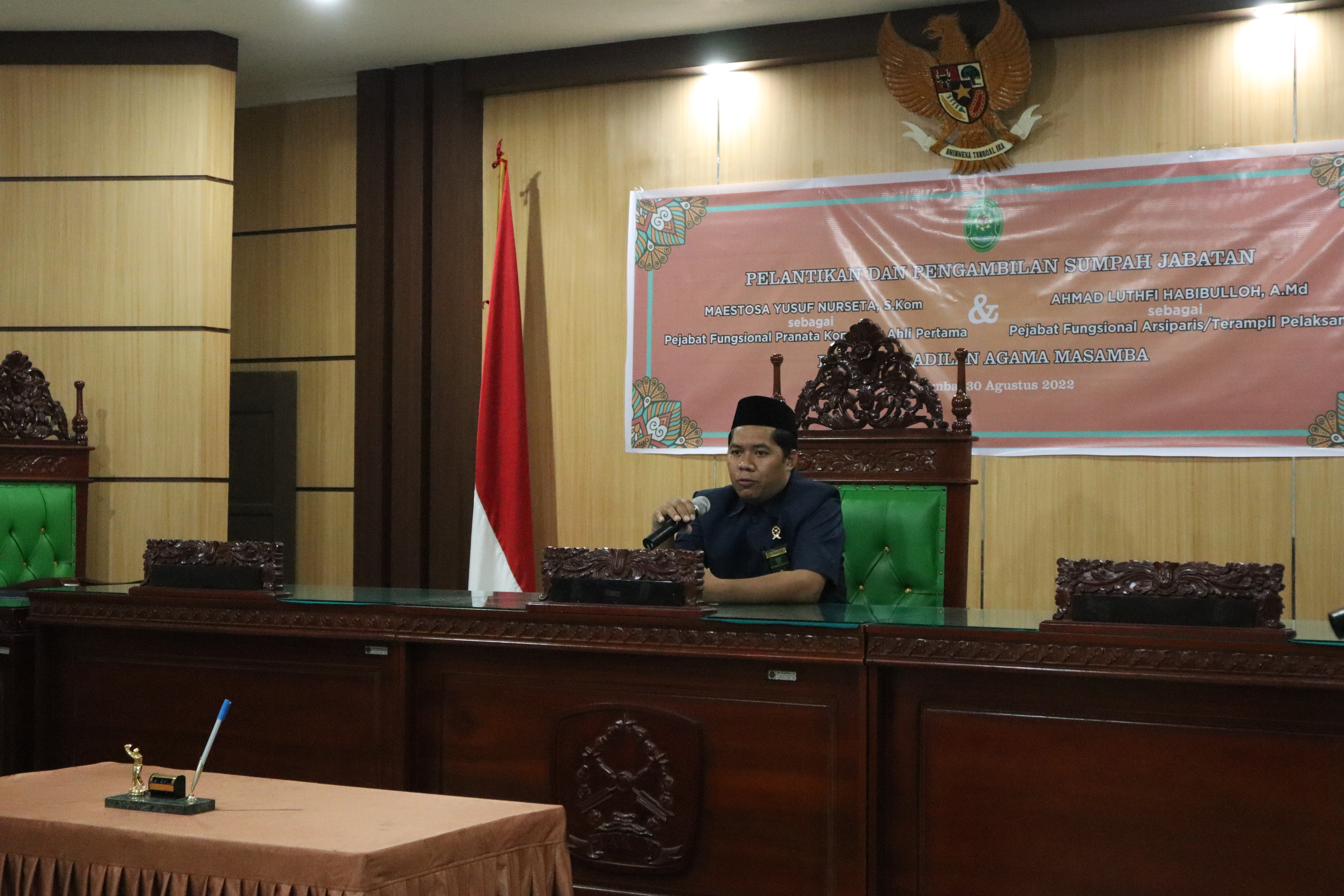 Setelah acara pelantikan dan pengambilan sumpah jabatan, Ketua Pengadilan Agama Masamba berkenan memberikan sambutan dan arahan kepada pejabat yang dilantik, dengan mengucapkan selamat atas pelantikannya. Bahwa Jabatan ini merupakan jabatan yang baru dilingkungan Pengadilan Agama Masamba, sehingga patut disyukuri bagi pejabat yang telah dilantik dan juga satuan kerja. Diharapkan, dengan dilantiknya jabatan tersebut menambah semangat dalam bekerja sesuai dengan tanggung jawab yang diemban dan memberikan kontribusi yang besar bagi satuan kerja Pengadilan Agama Masamba.