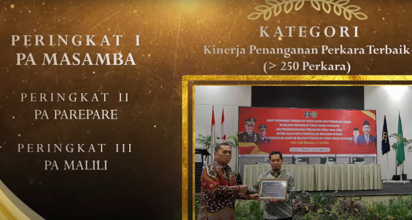 Masamba – Pengadilan Agama Masamba menerima penghargaan peringkat I dalam penilaian Kinerja Penanganan Perkara Terbaik se-Wilayah Pengadilan Tinggi Agama Makassar periode Semester I Tahun 2023 (Kategori ≥ 250 perkara) pada hari Senin, 31 Juli 2023 di Claro Hotel Makassar. Peringkat II diraih oleh Pengadilan Agama Parepare dan Pengadilan Agama Malili memperoleh Peringkat III pada penilaian Kinerja Penanganan Perkara Terbaik se-Wilayah Pengadilan Tinggi Agama Makassar.