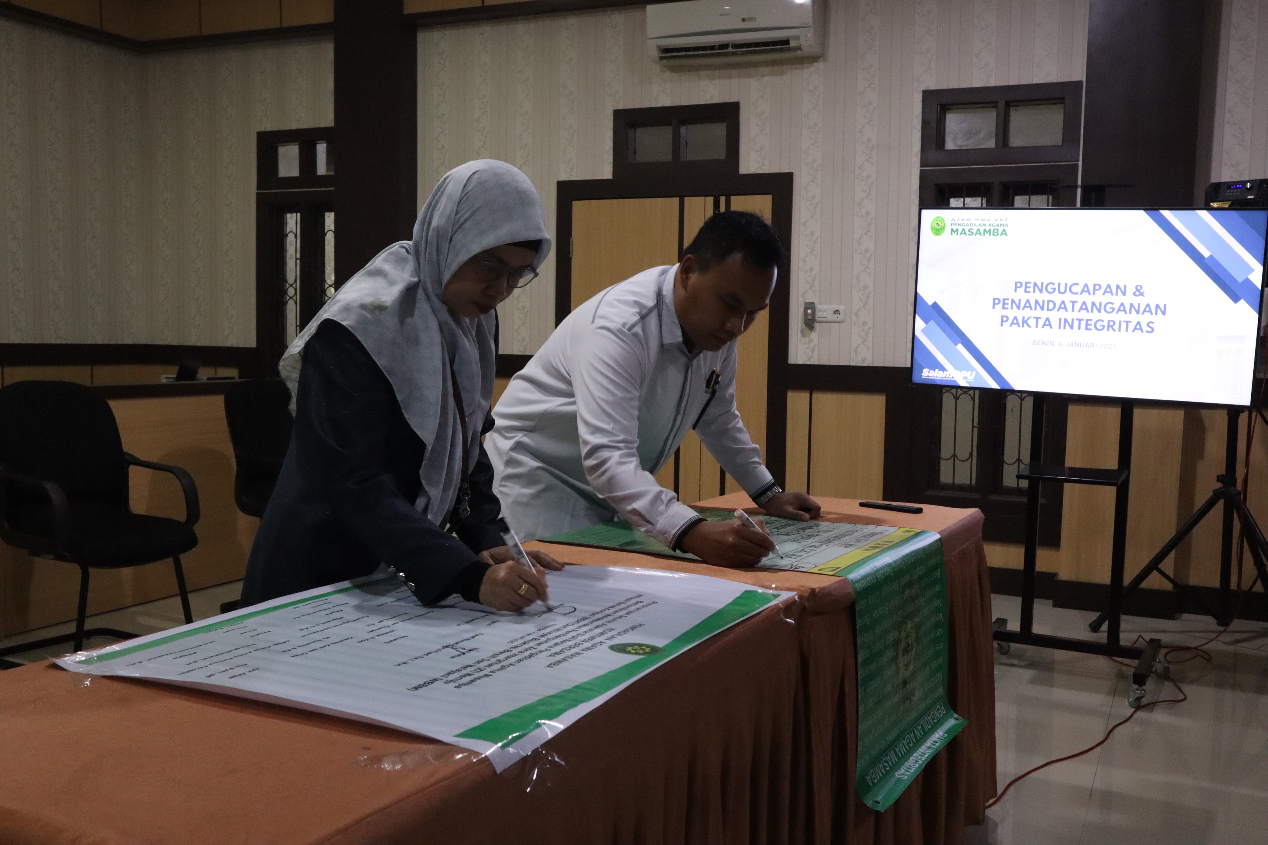 Pakta Integritas adalah janji tertulis yang berisi komitmen untuk melaksanakan tugas dengan penuh integritas dan menghindari KKN. Integritas merupakan nilai penting yang harus dijunjung tinggi setiap aparatur Pengadilan Agama Masamba. Semoga dengan pengucapan dan penandatanganan pakta integritas seluruh aparatur Pengadilan Agama Masamba dapat menjalankan tugas dengan amanah, penuh integritas dan terhindar dari KKN.