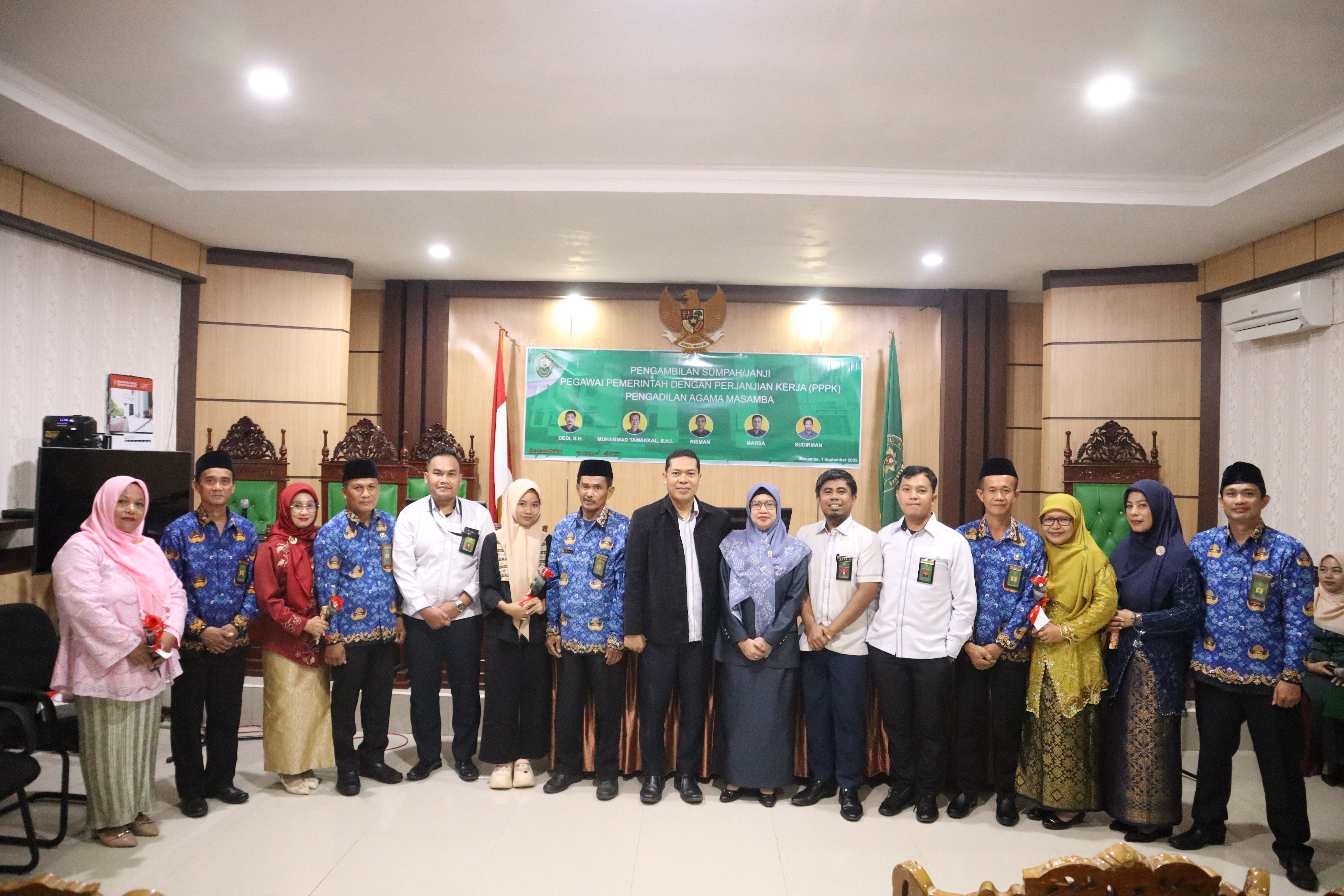 Acara ini merupakan proses dalam pengangkatan PPPK yang akan melaksanakan tugas di Pengadilan Agama Masamba. Calon PPPK yang melaksanakan pengambilan sumpah janji diantaranya Dedi, S.H., Muh. Tawakkal, S.H.I., Sudirman, Risman dan Marsa. Mereka sudah mengabdi sebagai PPNPN Pengadilan Agama Masamba dalam waktu yang cukup lama. Dengan diambil sumpah janjinya diharapkan kepada seluruh PPPK Pengadilan Agama Masamba untuk melaksanakan tugas dengan penuh tanggung jawab, profesional, dedikasi dan intergitas dalam memberikan pelayanan kepada masyarakat pencari keadilan.