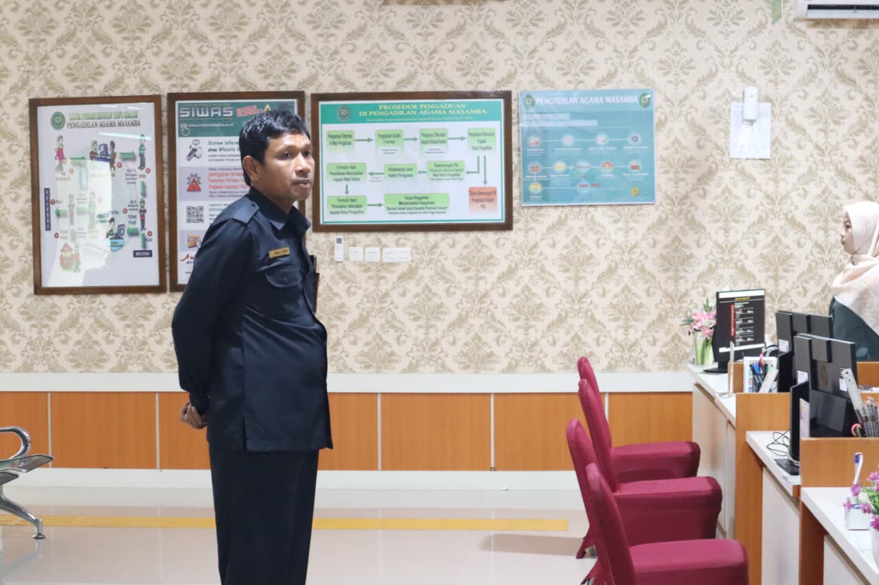 Petugas PTSP yang merupakan garda terdepan pelayanan pada Pengadilan Agama Masamba secara rutin mendapatkan pembinaan dari pimpinan, hakim, kepaniteraan dan kesekretariatan secara bergantian. Pada Selasa, 16 Desember 2025 Kasubbag Kepegawaian dan Ortala, Awaluddin, S.P., S.H. memberikan pembinaan kepada petugas PTSP.