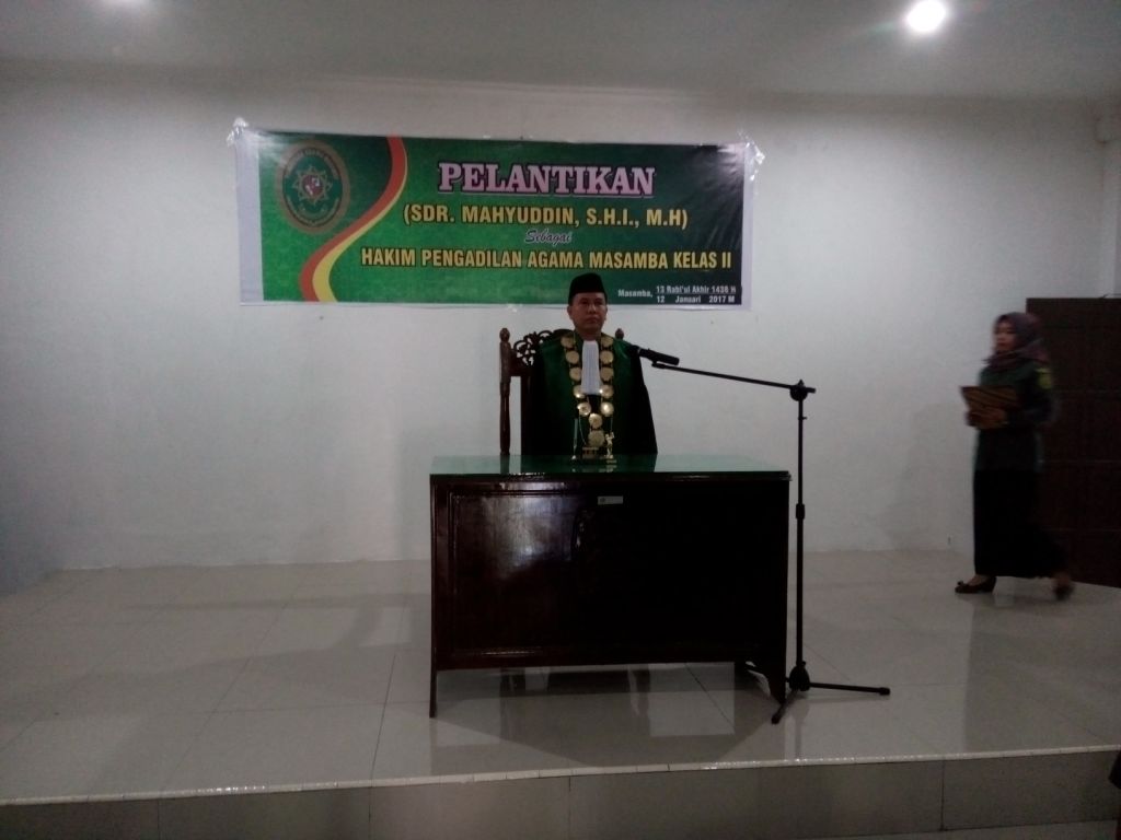 Kamis, 12 Januari 2017, Ketua Pengadilan AgamaMasamba Drs. Muhammad Ridwan, S.H., M.H. melantik satu orang Hakim yaitu bapak Mahyuddin, S.H.I., M.H. pelantikan Hakim ini di hadiri oleh seluruh warga Pengadilan Agama Masamba mulai dari Ketua dan Wakil Ketua, para Hakim, Pejabat Fungsional dan Struktural serta pegawai PNS dan Non PNS. Pelantikan ini dihadiri pula oleh keluarga yang mengantar Hakim yang baru dilantik.